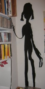 And there it is, folks. He made it for me. My very own shadow (suck it Peter Pan!). It’s a pretty good likeness only you can’t tell here cause her head is drooping. I should fix it and take another picture. Here’s what it looks like when the tacks haven’t fallen out.