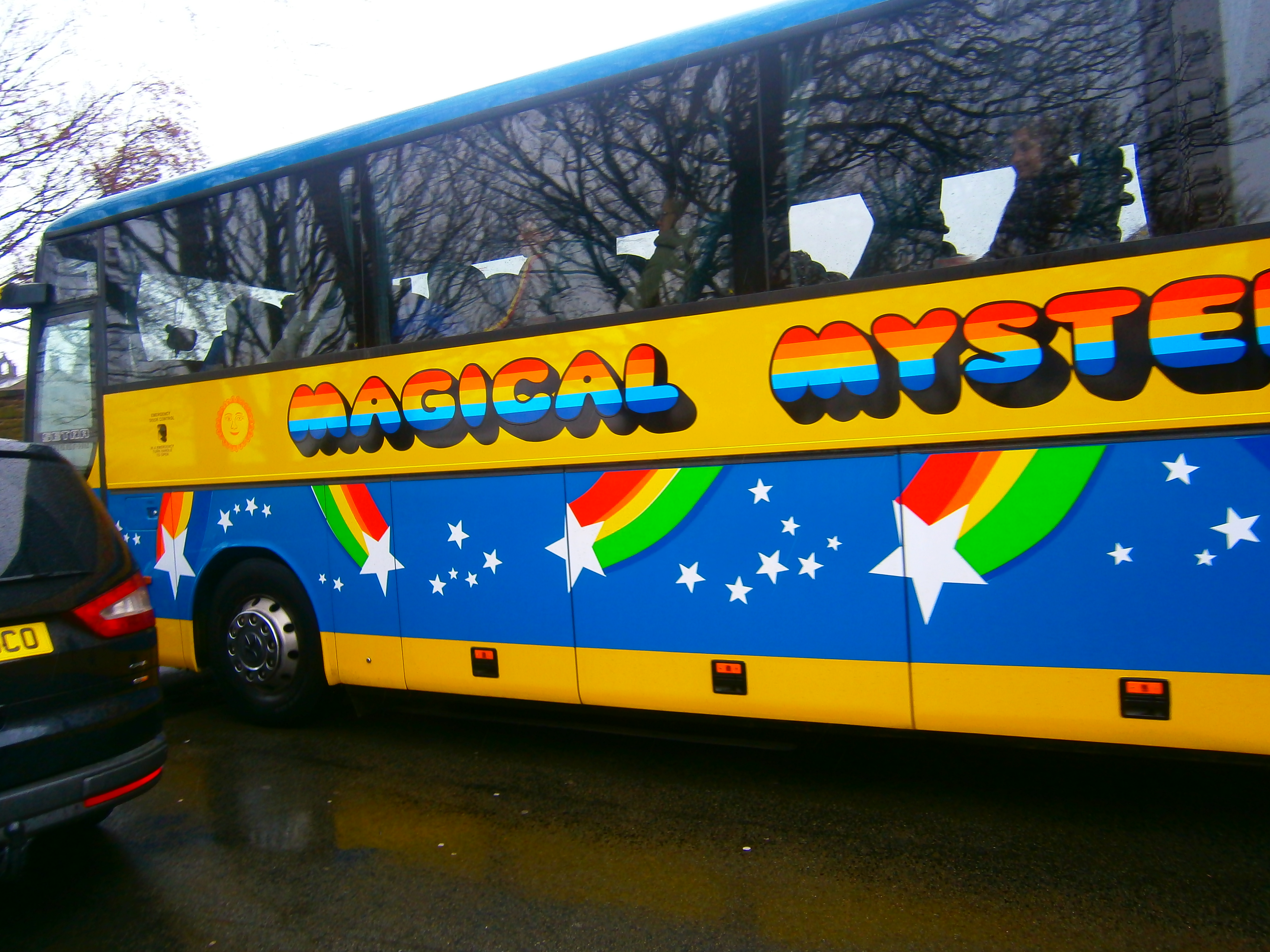 In the distance, is the Magical Mystery Tour Bus.