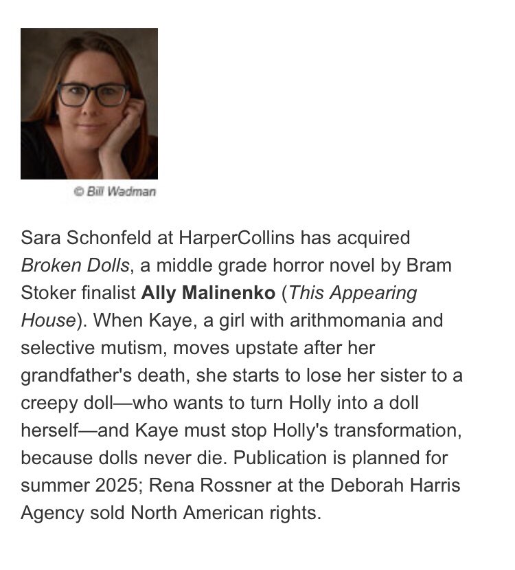 That’s right my third stand alone middle grade horror about grief, creepy dolls, and what it really means to be alive is coming out with Harper Collins in 2025. Which means, for those playing along at home, I will have TWO books out in 2025. My homage to all things Little Women and my first foray into adult writing, THE OTHER MARCH SISTERS and now, BROKEN DOLLS.